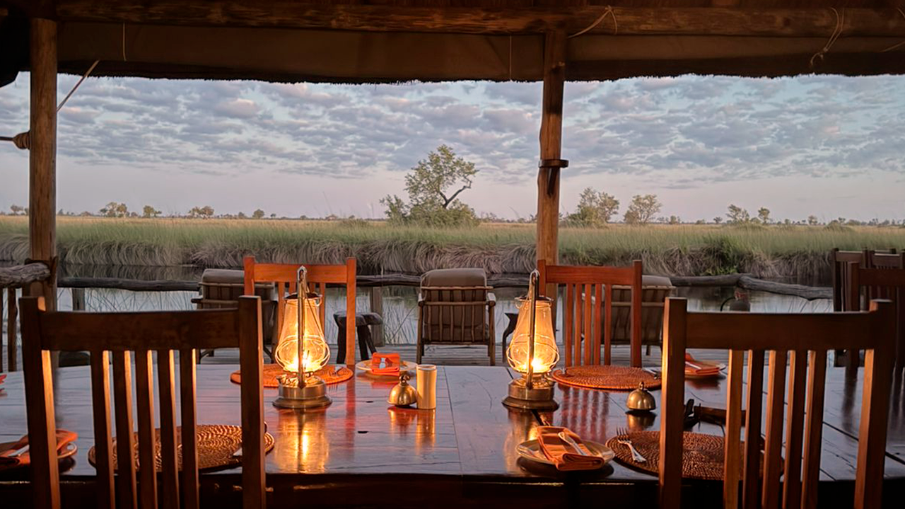 Camp Xakanaxa — pronuncia-se Ka-ka-na-ka — é provavelmente o mais autêntico dos três. Localizado nas margens da Lagoa Xakanaxa, dentro da Reserva Moremi, o camp preserva a essência da tenda clássica africana Meru: estilo que evoca as grandes expedições do século passado, sem abrir mão do conforto. À noite, dezenas de lamparinas e velas iluminam o camp com uma luz que parece pertencer a outro tempo.